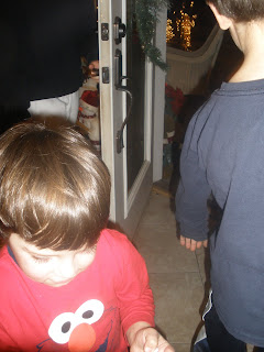 Shortly after dinner we hear a knock at the front door. Upon inspection we find that Santa left some early presents for the kids. This tradition started two years ago when we discovered Aiden had a fear of Santa that was so bad that when he saw Santa he threw up. So the tradition of having Santa come and visit on Christmas Eve changed to presents being left at the front door.
